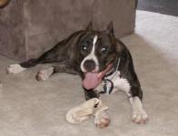 CH Pirouette's Treasure of Divinity, TT, OFAg/el/pa/ca, Ataxia Clear Devani was our first! She is a great example of the American Staffordshire Terrier in every way. Chip has shown her to her Championship. This next year I will take her through obedience, rally and then agility! I am really excited to see what she's made of... her abilities this far show me that she will really enjoy the action in these types of competition. Her first litter was born March 3rd, 2008!!! Check out her breeding plans for early 2010 and sometime in 2011!!